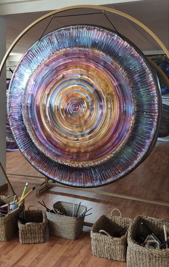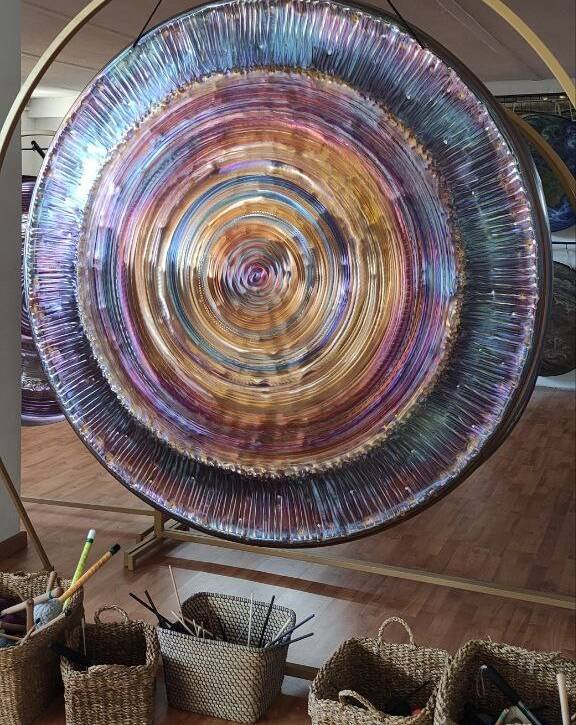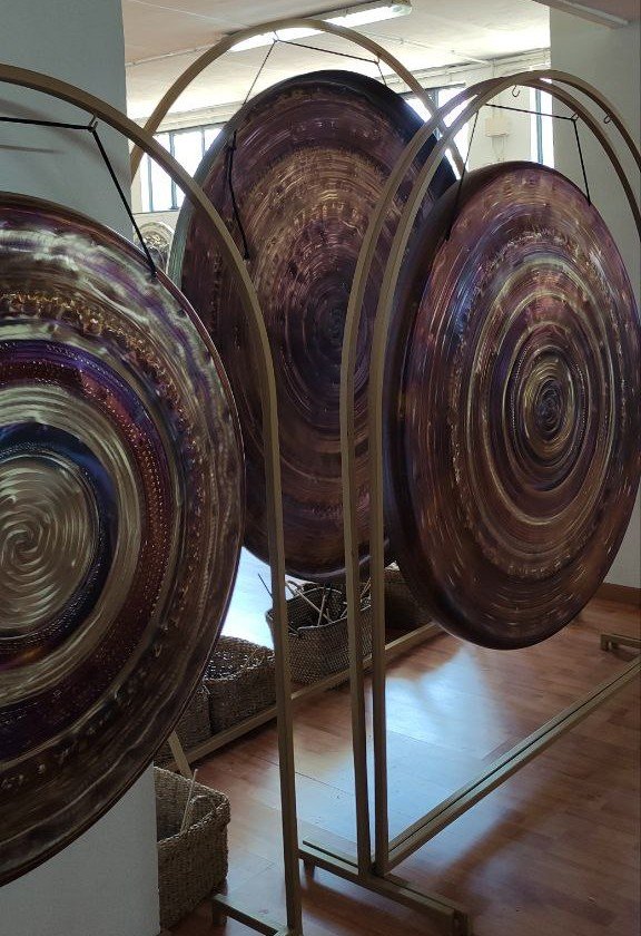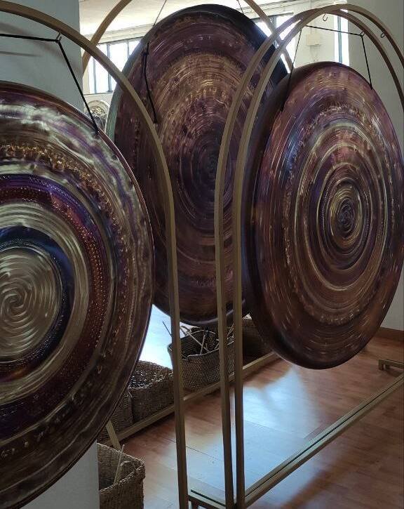 И вот мы оказались в необычайной студии Grotta Sonora, где пространство было увешано гонгами разных размеров, от 50 см до 150 см в диаметре. Атмосфера напоминала сказочный зал, наполненный вибрацией и звуком. Сначала нам предложили просто слушать, как звучат разные гонги, а затем мы сами взяли молот в руки и проверяли их силу.